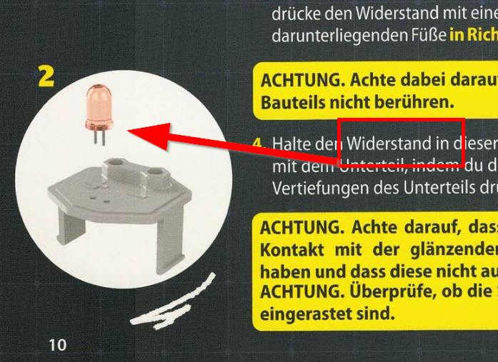 doch offenbar wurde „wirtschaftlich optimiert“ und die orangen Gehäuse kurzerhand grün produziert. - In der Anleitung wird der Zusammenbau der Widerstands-Gehäuse beschrieben – allerdings ohne Abbildung, stattdessen prangen mehrere LED-Bilder daneben.