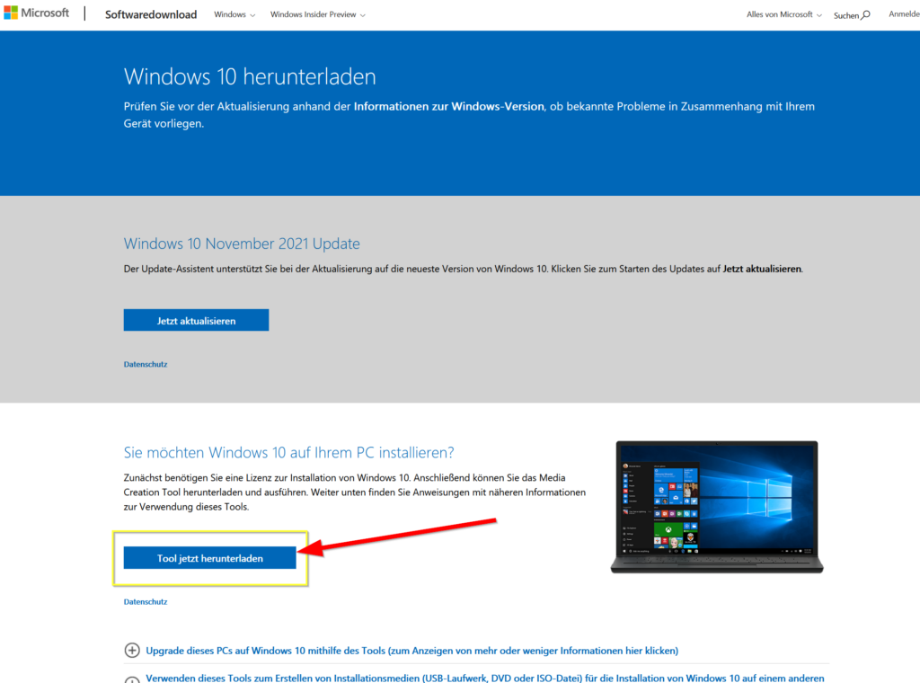 In Webbrowser auf folgende Seite von Microsoft navigieren und auf „Tool jetzt herunterladen“ klicken: