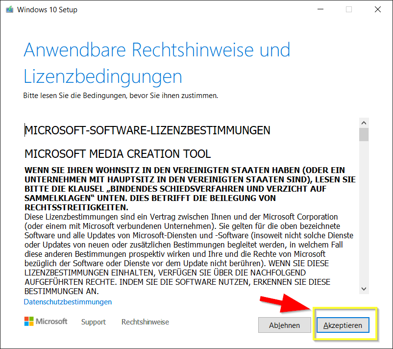 Nachem die Datei „MediaCreationToolXXXX.exe“ (XXXX steht für die aktuelle Version wie z.B.: 21H2) heruntergeladen/gespeichert wurde diese durch Doppelklick starten und folgende Schritte durchgehen: