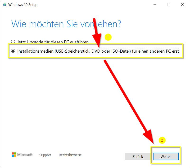Nun die zweite Option „Installationsmedien (USB-Speicherstick, DVD oder ISO-Datei) für einen anderen PC erstellen)“ auswählen und auf „Weiter“ klicken: