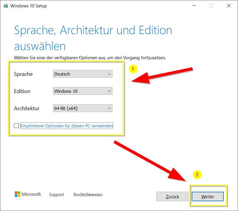 Normalerweise ist „Deutsch„, „Windows 10“ und „64-Bit (x64)“ als Standardwerte bereits ausgewählt.