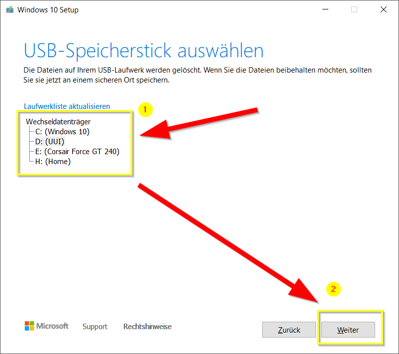 Bitte wähle jetzt dein USB-Speicherstick (Vorsicht! Nicht das falsche Laufwerk wählen!) welcher Du vorher angesteckt hast und klick auf „Weiter„: