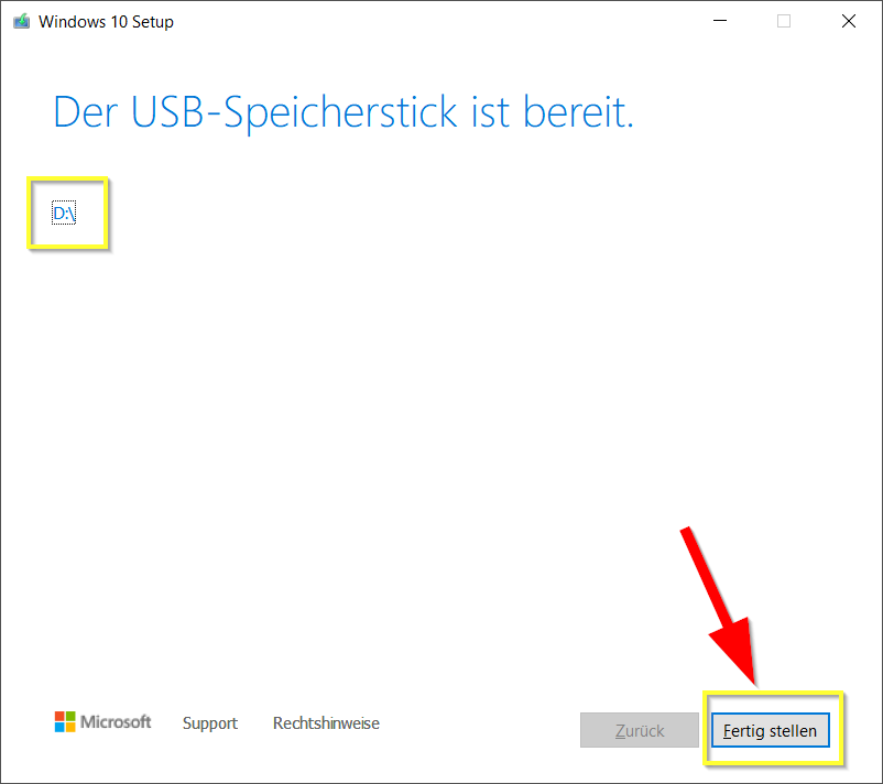 Wenn die Meldung „Der USB-Speicherstick ist bereit.“ angezeigt wird, kann man nochmal sehen auf welchem Laufwerk (in Beispiel-Bild „D:\„) der Windows-10-Installer sich befindet.